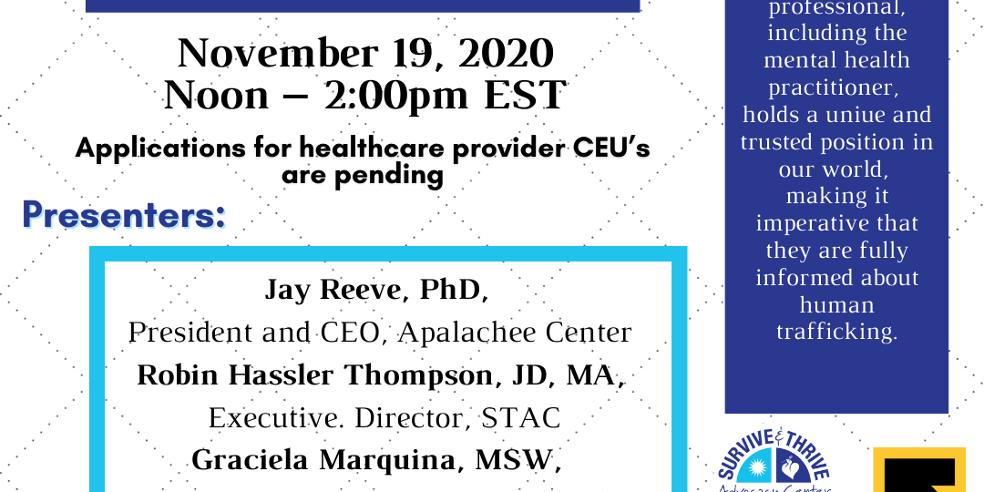 Every healthcare professional, including the mental health practitioner, holds a unique and trusted position in our world, making it imperative that they are fully informed about human trafficking. This session will meet the requirements of Florida law regarding human trafficking education and help attendees to identify both sex and labor trafficking within their practice setting, understand how to best respond, and learn about resources to support trafficked persons and those who are at risk of being trafficked. Please register early. Space is limited!